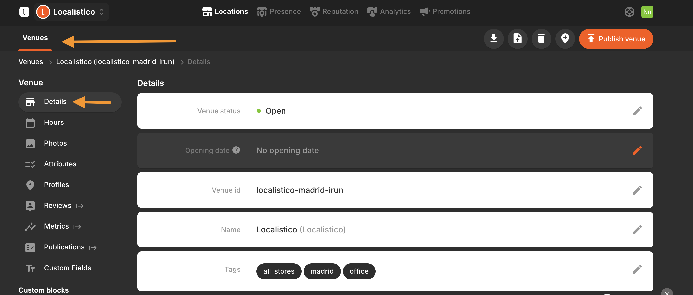 1. Go to the Venues tab → Details and scroll down to the Located In field.