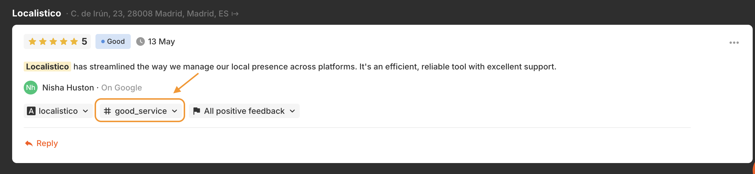 Reviews can also be tagged automatically based on the keywords. See this article to know how it is done! Please note that this is a premium feature and may not be included in your current subscription.