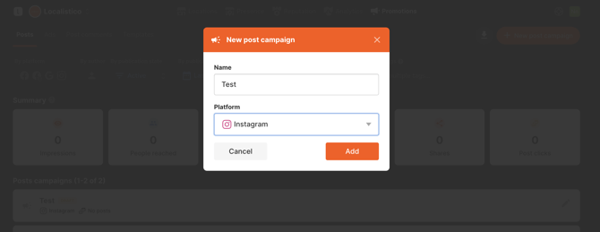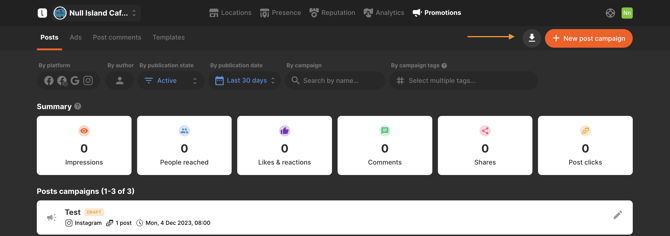 In order to create a campaign, navigate to the Promotions tab and open Posts. Click on +New post campaign to create your first Instagram post: