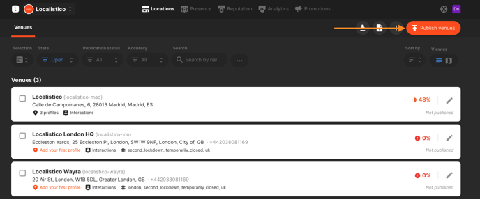 Please remember that every time you make a change, you must publish the locations from Localistico. In this case, since changes affect all or most of the locations, we advise you to click on Publish All.