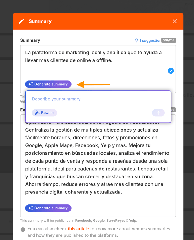 - Describe your business, so the AI can create a summary based on your input.