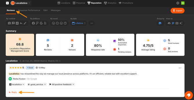 1. Open the Reviews section, find the review you want to respond to, and click the Reply button.