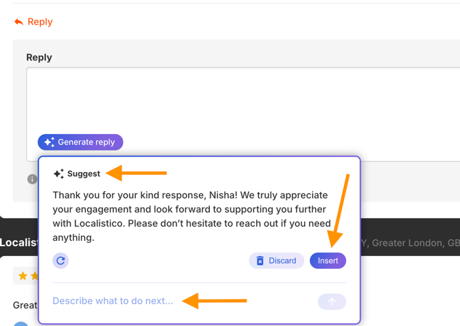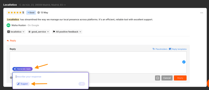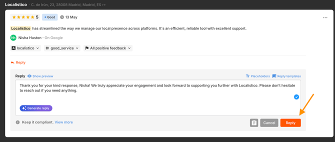 4. After inserting the reply and reviewing it, click Reply to send your response to the platform (e.g., Google).