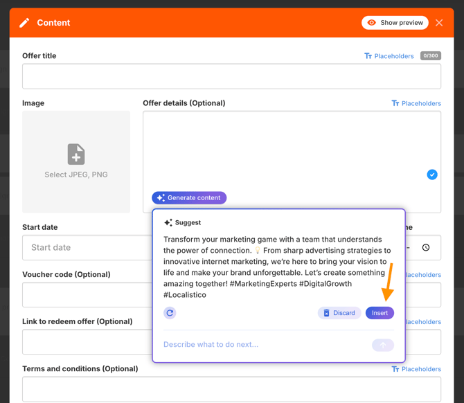 5. Review the AI-generated suggestions, make any adjustments, and click Insert to add the content to your post.